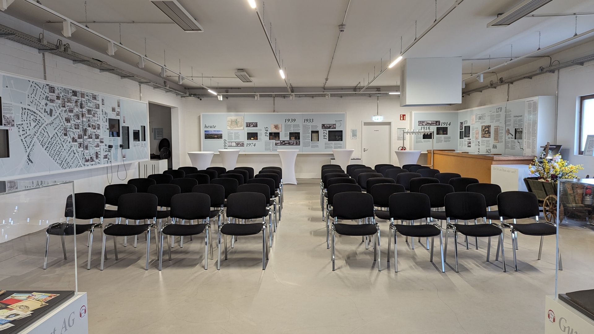 Der Anfang der großen Halle kann auch für Vorträge oder Versammlungen eingerichtet werden. Mit unseren Stühlen können 50 Personen Platz nehmen.